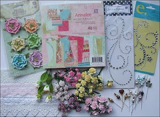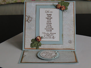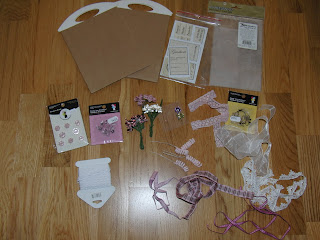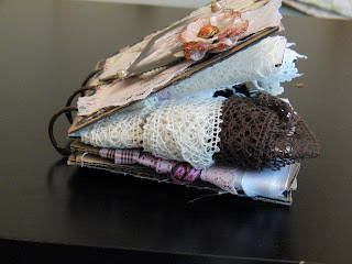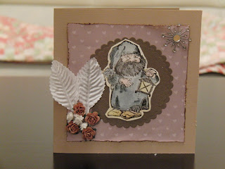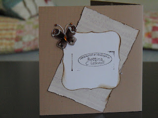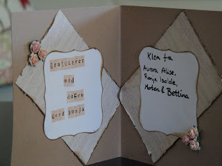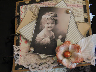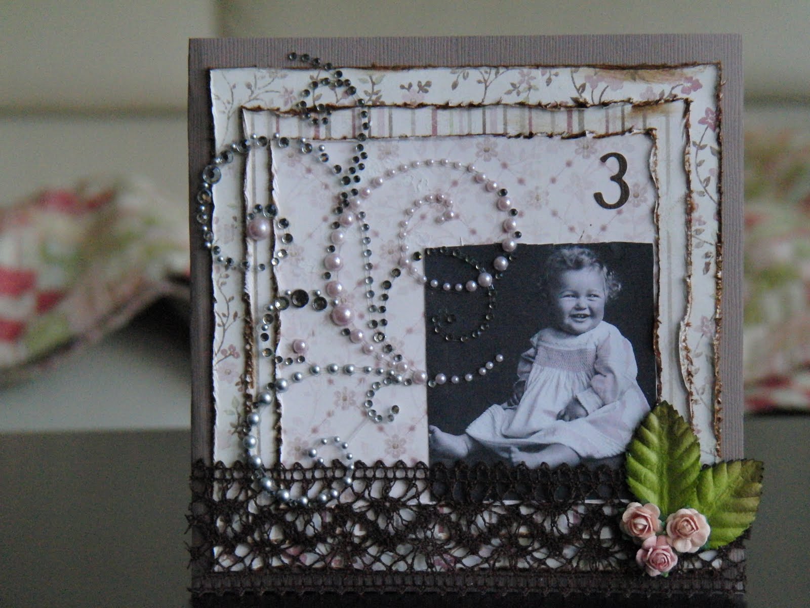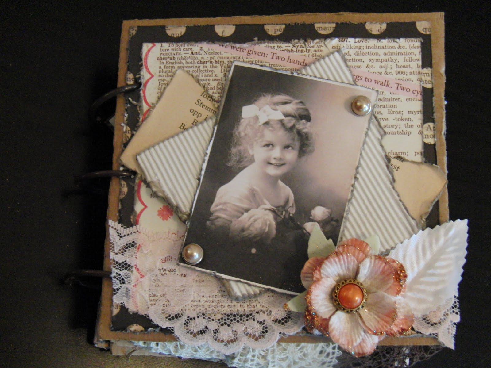 Vintage bilde design Gudrun Loennecken for Minne-hjørnet a/s, prima flowers: ameruse duchess mix, en tilfeldig gammel bokside og brads fra papirloftet (lattefarget tror jeg), hvitt blad og rosa bånd. Og deler av en pizzaeske:). Raspet kanter og svertet med punice stone.