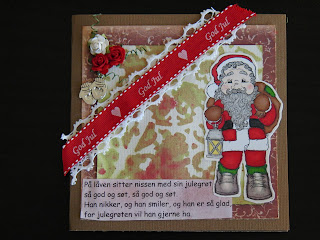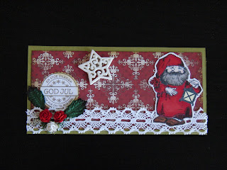 Tradisjonelt julekort (rødt, hvitt, brunt). Med nissemotiv og tekst og det skal være liggende.