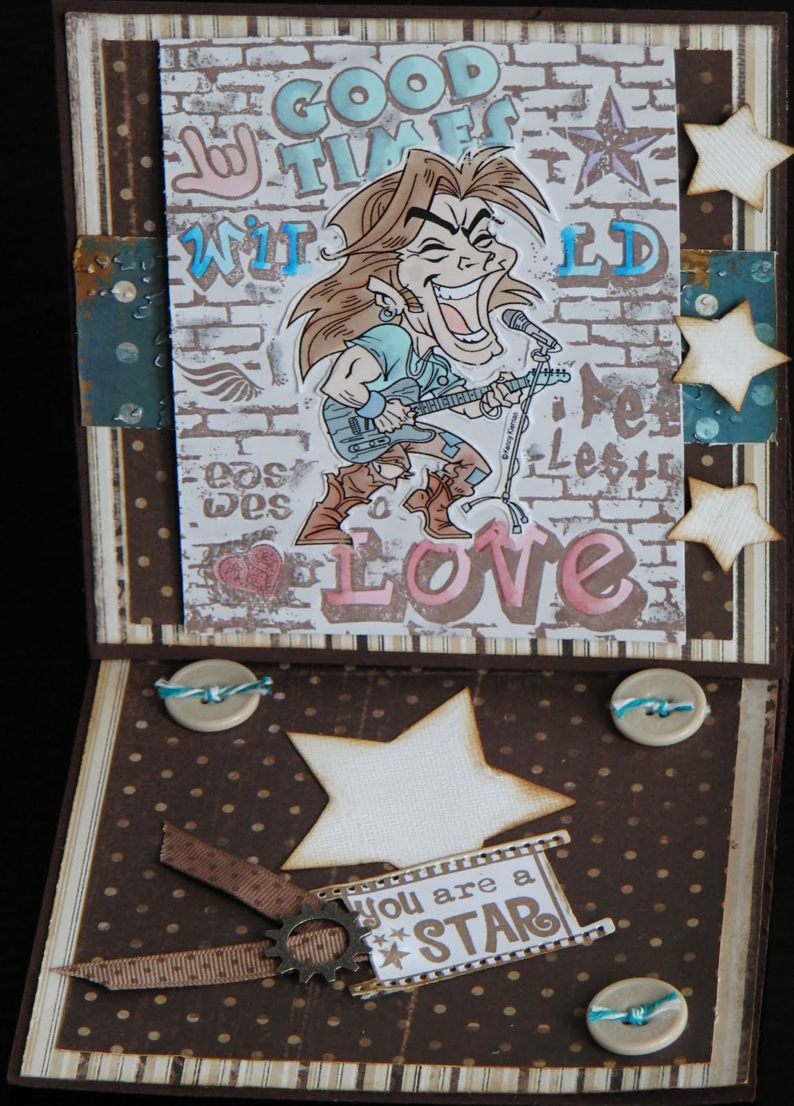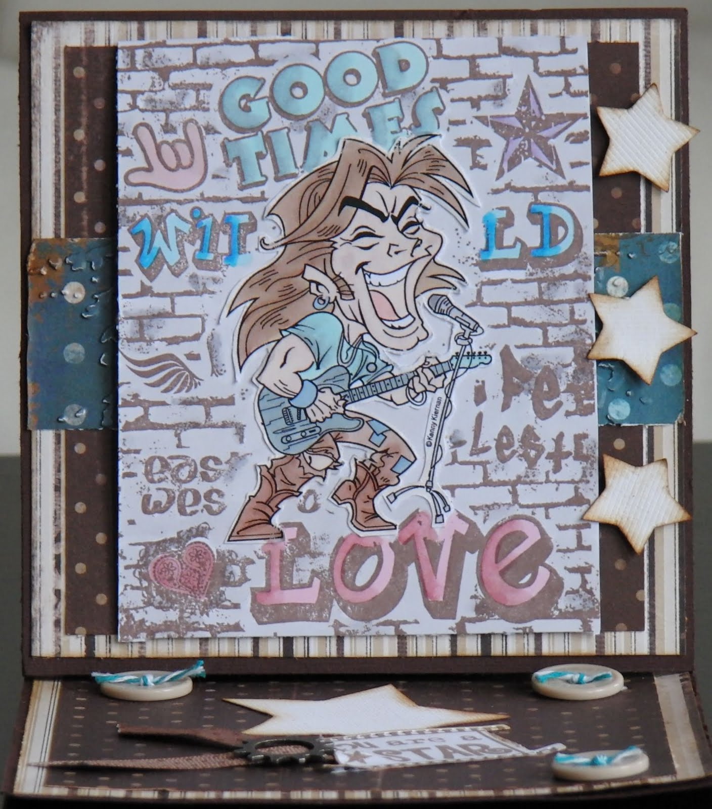 My stamp for this card is a digi from Kenny K called Rock dude. He's coloured with these promarkers: dusky pink, ivory, putty, cocoa, cinnamon, tan sandstone, ice grey 3,2, 1, denim blue, grey green, cool aqua, pastel green and pastel pink. Plus dusky pink, baby pink, pale pink, cyan and blue pearl.