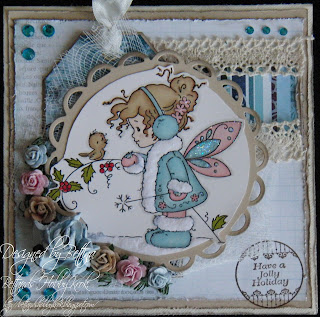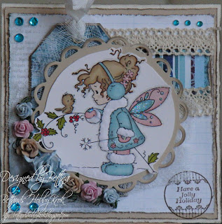 As I just told you my image is from Tickled Pink Stamps and is called Lil Victorian Christmas Lolita Kellita. She is coloured with these promarkers: dusky pink, ivory, putty, blush, dusky rose, cocoa, chestnut, cinnamon, grey green, marsh green, pear green, crimson, poppy, berry red, sandstone and cool grey 1.